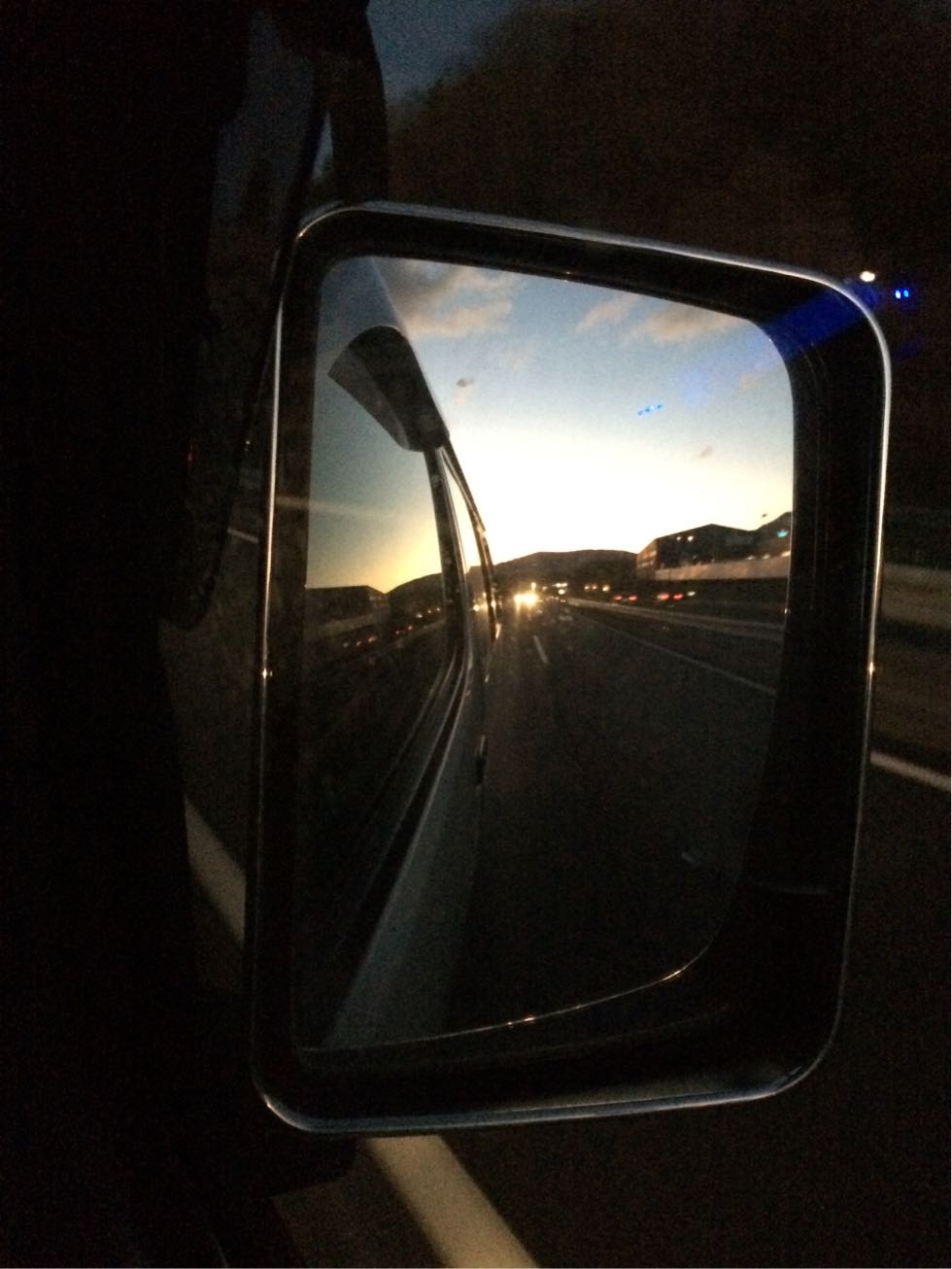 画像は、高速道路走行中、バックミラーに映る夕日^^