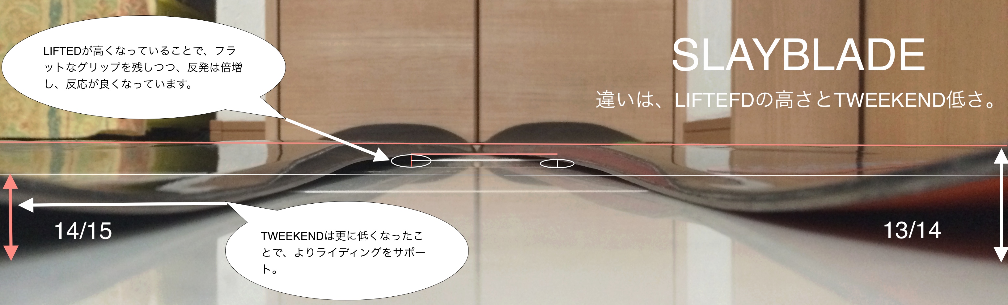 来期、14/15モデルは、前期のモデルよりも、リフトが高くなっており、ノーズとテールのキックが低くなっており、tweakendと呼ばれるプレスゾーンが広くとられています。
